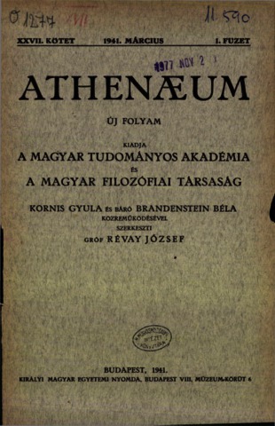 | Additional Information: | Athenaeum Új folyam 27. kötet (Budapest, 1941) |
