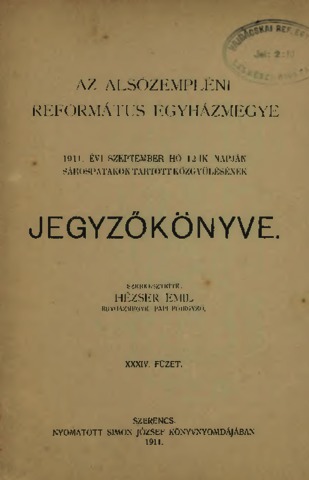| Additional Information: | Az Alsózempléni Református Egyházmegye 1911. évi szeptember hó 12-ik napján Sárospatakon tartott közgyűlésének jegyzőkönyve | Forrás: Sárospataki Református Kollégium Tudományos Gyűjteményei |