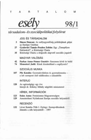 Esély : Társadalom és szociálpolitikai folyóirat, '98 (1-6) - 1998. ISSN 0865-0810