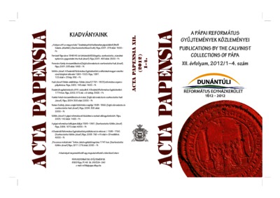 Publisher: Dunántúli Református Egyházkerület Tudományos Gyűjteményei